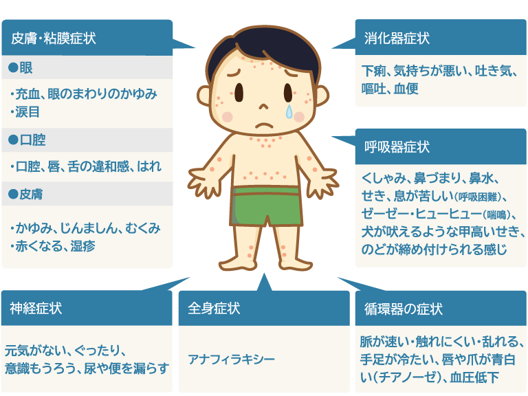 原因となる食物を食べた後、アレルギー症状が一つの臓器に留まらず、皮膚消化器、呼吸器、循環器、や神経等複数の臓器に対して強いアレルギー反応を起こします。