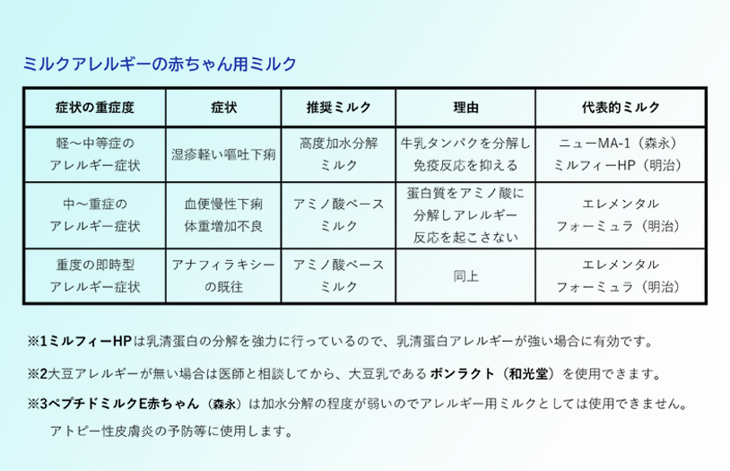 ミルクは乳児には非常に重要な栄養源です。ミルクアレルギーの赤ちゃんにはどのようなミルクを与えたらよいのでしょうか?表にまとめてみました。