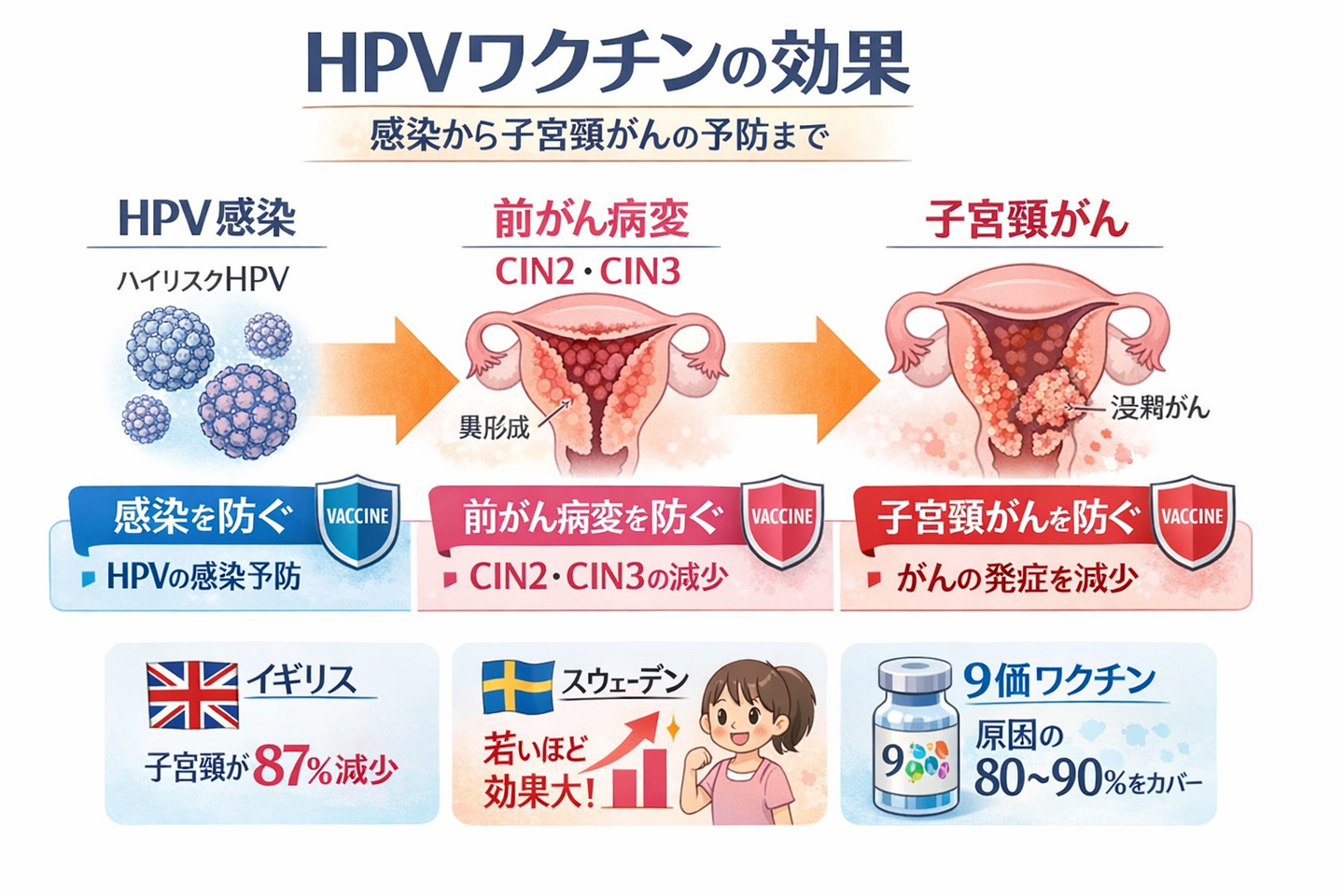 スウェーデンでは大規模追跡研究では浸潤子宮癌リスクが大幅に低下、特に17歳未満で接種した群で効果が大きい事が示されています。