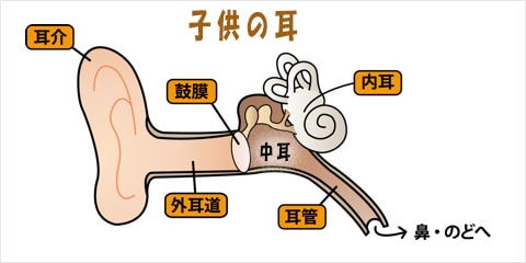 急性中耳炎は風邪やアレルギー性鼻炎等が原因で喉の奥で細菌が増え、これが耳管を通じて中耳に到達して起こります。子供はよく中耳炎になりますが、大人に比べて風邪をひきやすいのと、耳管が大人と違って太く短く、傾きも水平に近いので鼻の細菌が耳に到達しやすいからです。